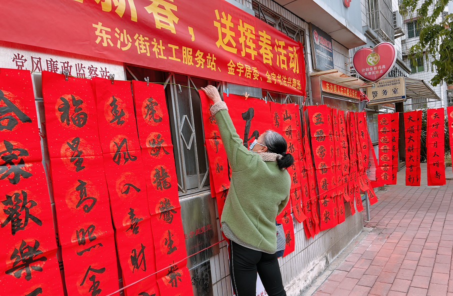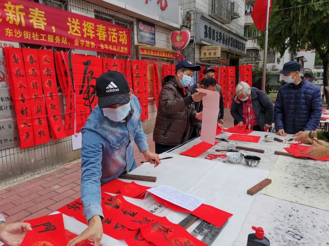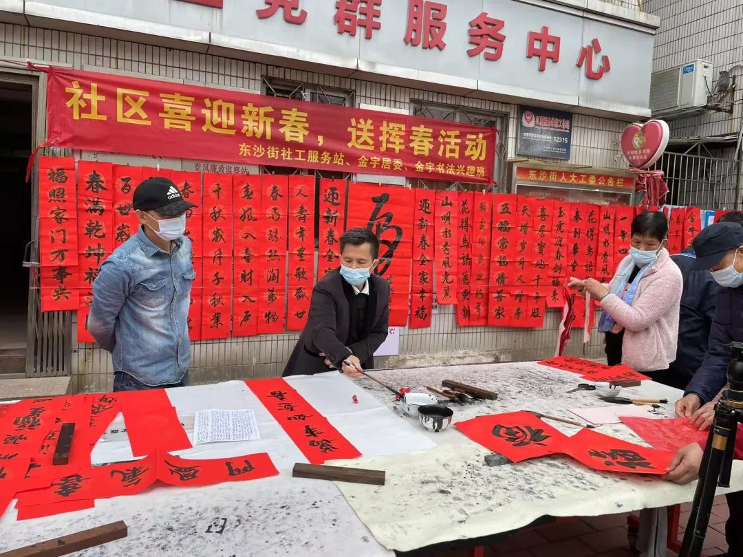 据了解,东沙街社工服务站每年都会邀请金宇社区书法兴趣班的书法家们为社区居民们写春联。