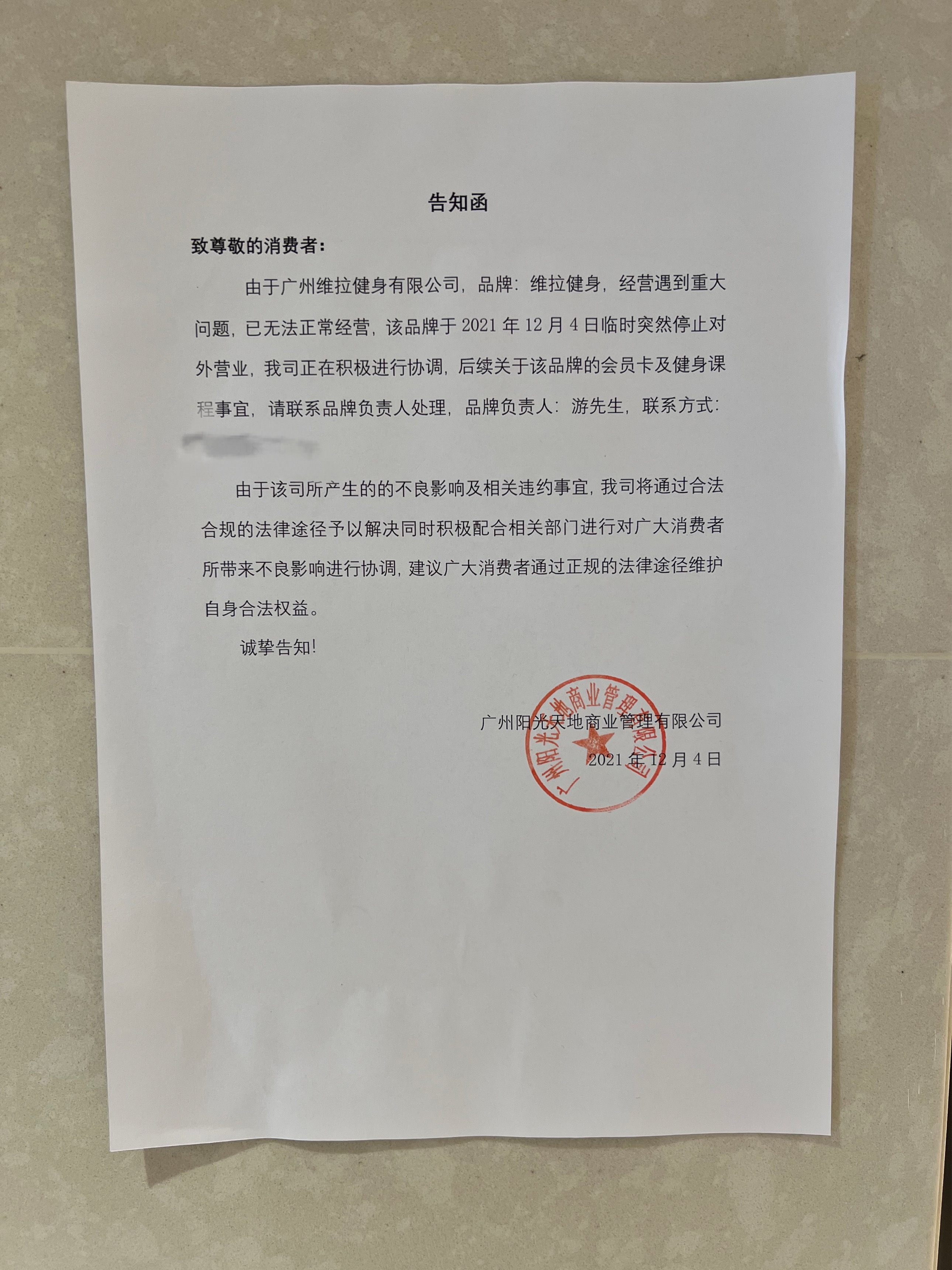 12月4日,广州阳光天地商业管理有限公司贴出公告:由于广州维拉健身有限公司(品牌“维拉健身”)经营遇到重大问题,已无法正常经营,该品牌于 2021 年 12 月4日临时突然停止对外营业,阳光城物业管理公司正在积极进行协调,后续关于该品牌的会员卡及健身课程事宜。由于该司所产生的不良影响及相关违约事宜,请联系品牌负责人处理,阳光城物业管理公司将通过合法合规的法律途径予以解决,同时积极配合相关部门对广大消费者所带来不良影响进行协调,建议广大消费者通过正规的法律途径维护自身合法权益。
