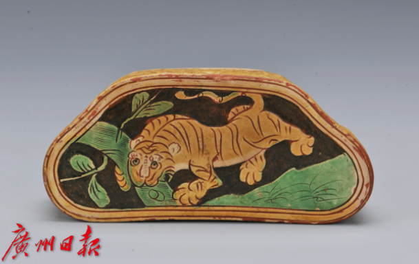 金代河津窑三彩剔地刻虎纹三瓣花形枕。这件瓷枕构图自然洒脱,用笔自由奔放,老虎以粗犷、凝练的形象进入了装饰艺术中,表现出刚劲、质朴的北方风格。(南越王博物院院藏)