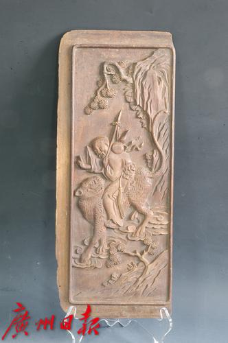 清代木雕“铁拐李骑虎”图版。画面中,人虎和谐,仿佛赶着去赴一场仙家之约。图版反面没有任何纹饰图案,只雕有一繁体“寿”字。这件木雕有仙人赐福、延年益寿的美好寓意。(广州博物馆馆藏)