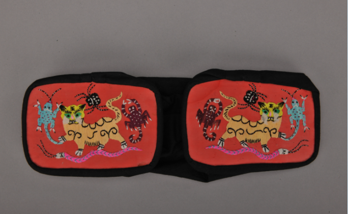 近代红缎地绣“虎镇五毒”图案黑布枕 (南越王博物院藏)