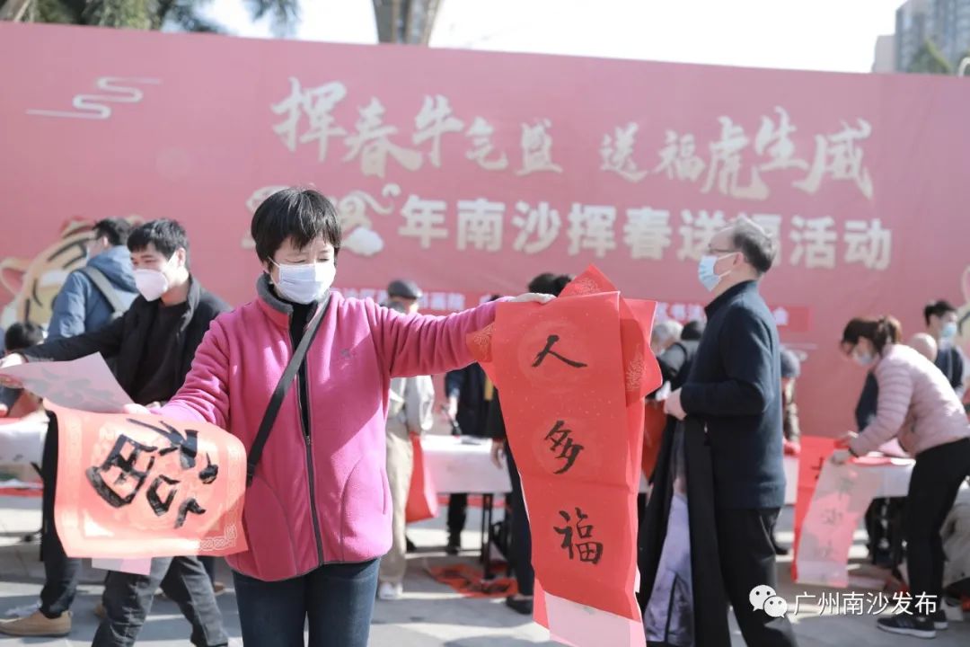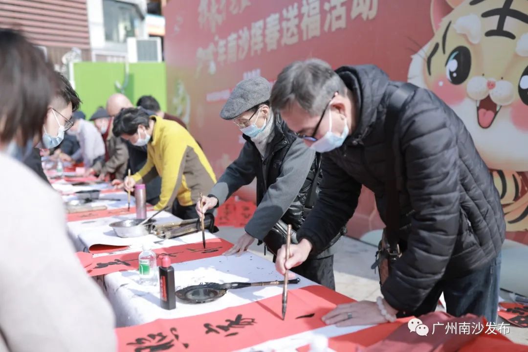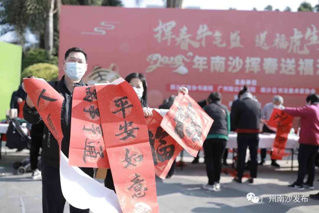 1月11日上午,南沙区政协书画院与广州致公书画院、区书法美术家协会联合举办的“挥春牛气盛·送福虎生威”挥春送福活动在广州南沙万达广场举行。南沙区的书法家们即席挥毫,为市民免费书写春联,送上虎年新春祝福。
