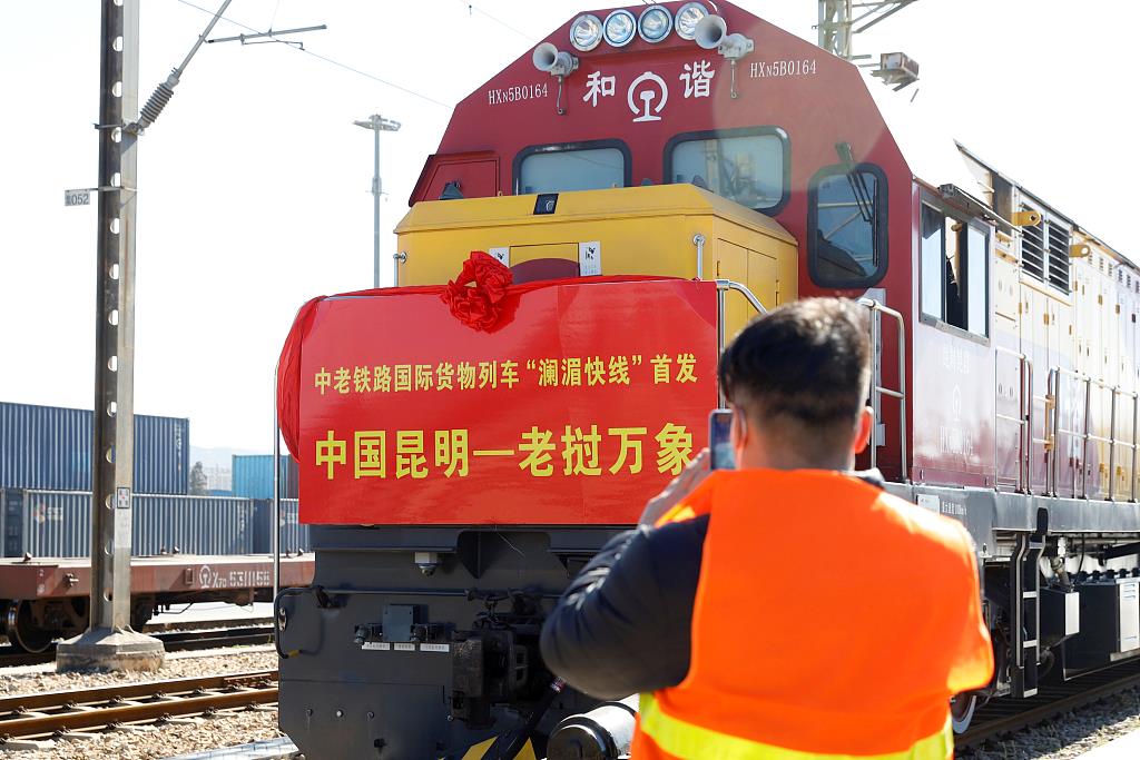 ▲2022年1月10日,中老铁路时速120公里国际货物列车“澜湄快线”首发。