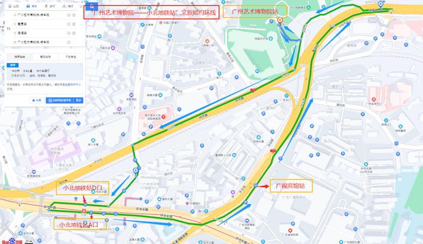 其中,“广州艺术博物院——地铁小北站”文旅如约专线起点设在广州艺术博物院正门口停车场,途经麓景路、环市中路、麓湖路,全程2.4公里,环线行车时间约15分钟,中途停靠地铁小北站D口、地铁小北站A口和广视宾馆等3个公交站。运营时间为周六周日和节假日,服务时间首班车为9:00时,末班车为16:00(约30分钟一班),假日期间视广州艺术博院预约入展厅人数增派车辆和调整发车班次,票价2元(不参与公交、地铁优惠)。