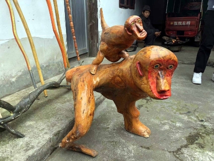 在简短的交谈后,李子昌老人上阁楼取出了自己的得意之作。这是一个半米高的木雕作品,一只大猴子背上驮着一只小猴,步履蹒跚,栩栩如生,像极了一个背负重物的老人。老人介绍,这是中国民间传统文化中的“辈辈封侯”,“背”同“辈”,大猴小猴也是祖孙“辈”。