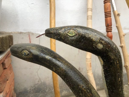 “我没有选择和老伴一起在县城带孙子就是因为水城村的悠然静谧,闲下来的时候是思想最活跃的时候,自己想要什么,木材像什么,只要想到了,都能动手去做。”说着说着老人又拿出了用自然缠绕的藤条雕刻的“相逢蛇”、用竹子做成的对联、竹枝钉制成的庙宇、一个个雕刻着龙头的拐杖,琳琅满目,这些作品,展示了这位老人的幸福晚年生活。