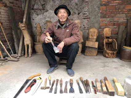 起初,没有雕刻基础,没有雕刻工具,只有山上找到的树枝、藤条等木材,老人仅凭自己的感觉动手。从最开始制作简易工具到现在雕刻生动的形象,从劈柴用的砍刀到锯子、凿子、刻刀、木锉、刨子等全套的雕刻工具,他坚持从实践中学习,老人家相信有志者事竟成和熟能生巧的朴素道理,用山上寻来的木材将自己脑海中想象的画面变成一个个摸得到的作品。