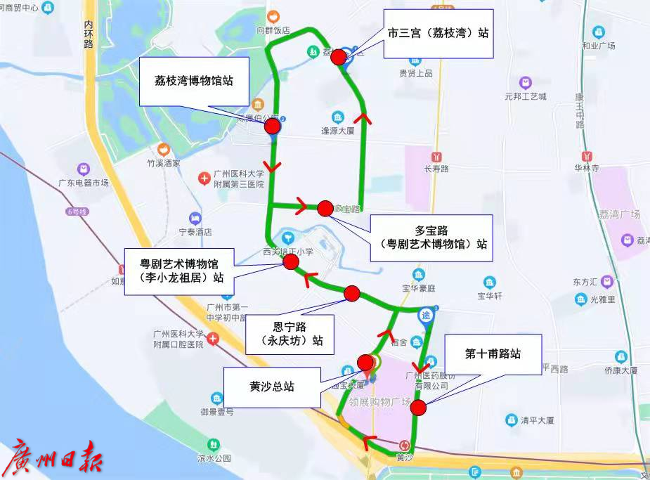 黄沙总站—恩宁路(永庆坊)—粤剧艺术博物馆(李小龙祖居)—多宝路(粤剧艺术博物馆)—市三宫(荔枝湾)—荔枝湾博物馆—粤剧艺术博物馆(李小龙祖居)—恩宁路(永庆坊)—第十甫路—黄沙总站