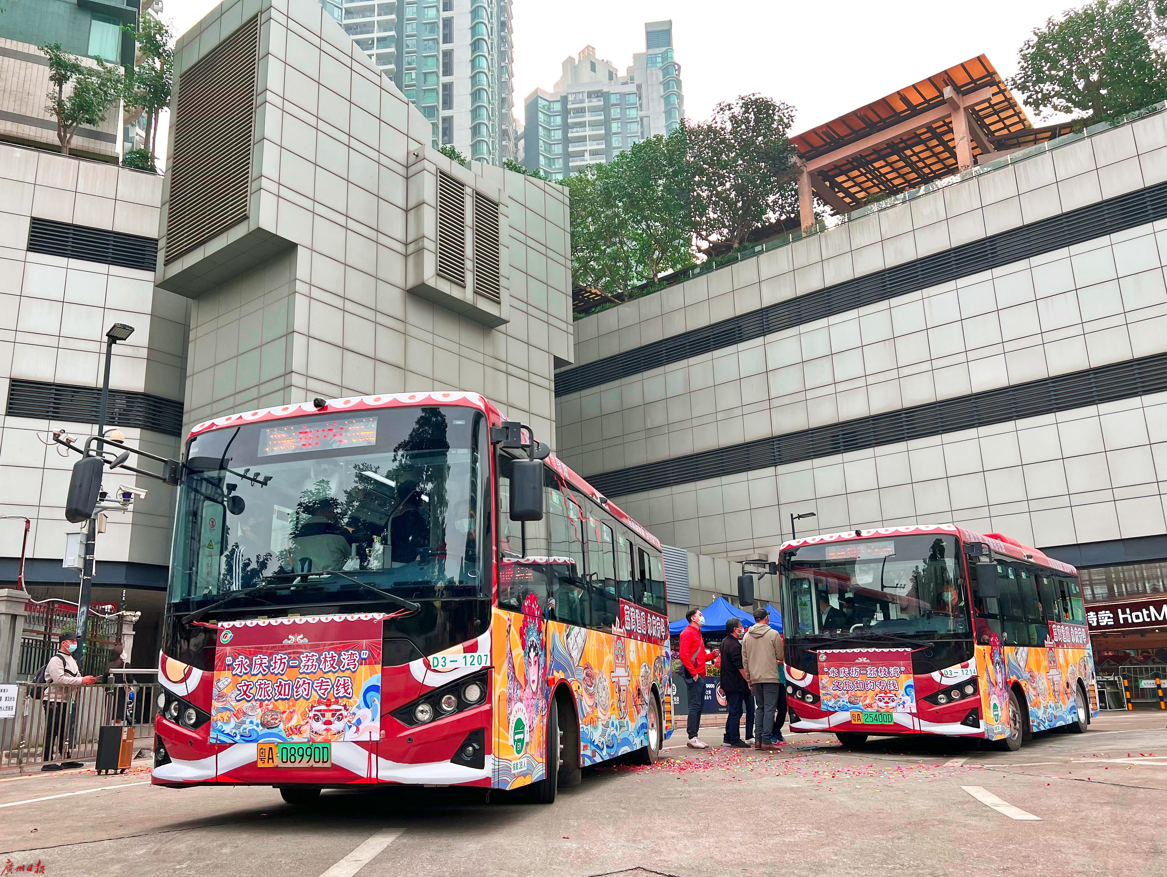 “永庆坊—荔枝湾”文旅如约专线所用车辆以“荔湾渔唱、永庆芳华”为主题,车身红黄的主色调格外醒目,涂装融入粤剧、醒狮、西关美食等传统岭南文化元素,把历史人文和现代都市生活融为一体,为乘客提供“车辆即景点、出行即体验”的特色服务。