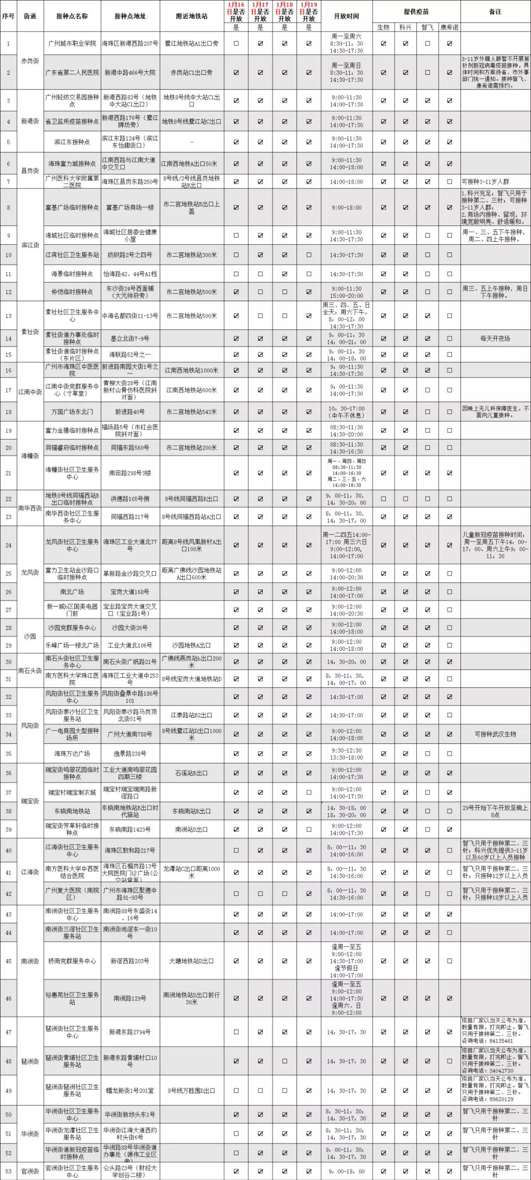 1月18-19日,广州市海珠区开放53个新冠病毒疫苗接种点,提供北京生物、武汉生物、科兴中维、安徽智飞、康希诺五种新冠病毒疫苗。