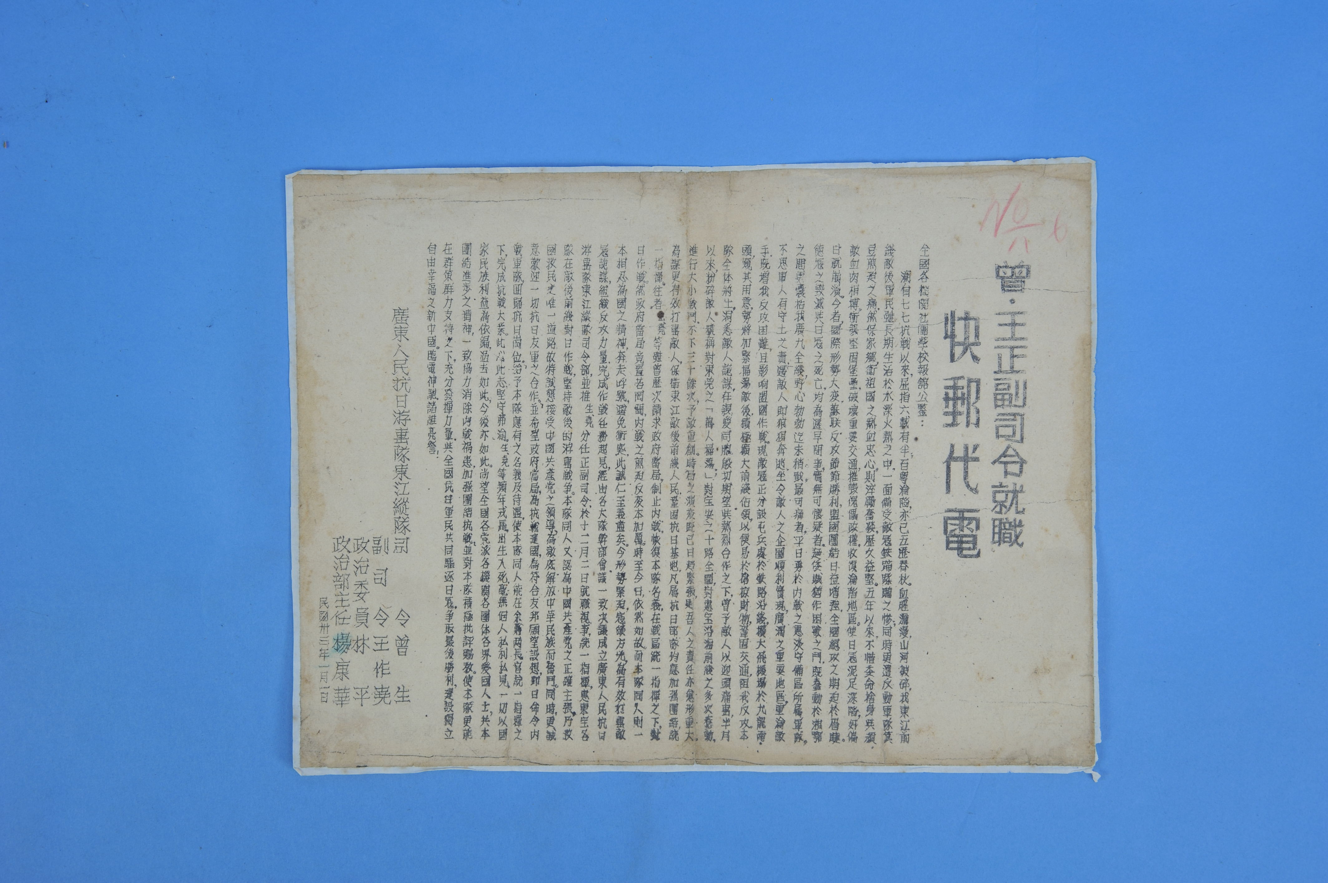 4.1944年1月1日东江纵队曾生、王作尧正副司令就职快邮代电