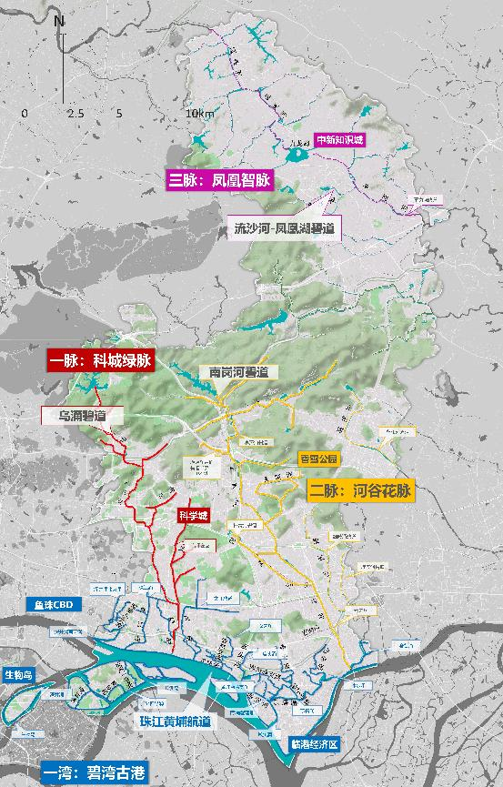 根据《黄埔区碧道总体规划(2020-2035)》,至2035年底黄埔区共计划建成碧道345公里,全面构建“凤凰智脉”“科城绿脉”“河谷花脉”和“碧湾古港”的“三脉一湾”碧道脉络。2021年,黄埔区以“五水共治”理念,统筹推进碧道建设工作,“三脉一湾”碧道脉络初具雏形。