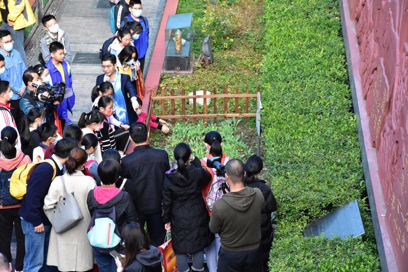 “哇,这里仅是一期工程展示的就有365种中药材!其中有我们认识的,也有很多不认识的,还有‘断肠草’、‘见血封喉’,真是让人大开眼界。”一位学生兴奋地说道。研学活动当天,除了学习板蓝根扎染,中小学生们还参观了神农草堂,体验板蓝根的“难”和“蓝”,360度认识板蓝根等中药材。在神农草堂中医药博物馆中,他们探究中医药缘起,学习岭南道地药材等知识,在“游”中发现问题、在“学”中应用知识,在“研”中解决问题,传承中医药文化。