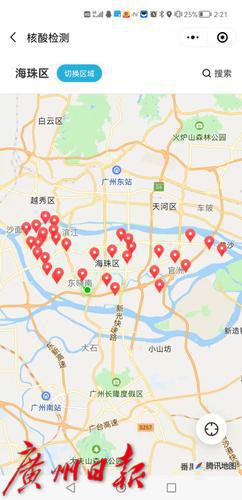 据海珠区政务数据负责同志介绍,“核酸检测地图”通过调用电子地图接口,实现全区核酸检测点在地理空间上的落点,形成全区核酸检测服务点“一张图”,可以根据用户当前定位,自动检索附近核酸检测点,方便市民快速前往。市民还可以通过区域切换功能按键,了解辖区内18条街道开放的核酸检测点的具体位置及详细信息,让市民对核酸检测点信息“一目了然”。