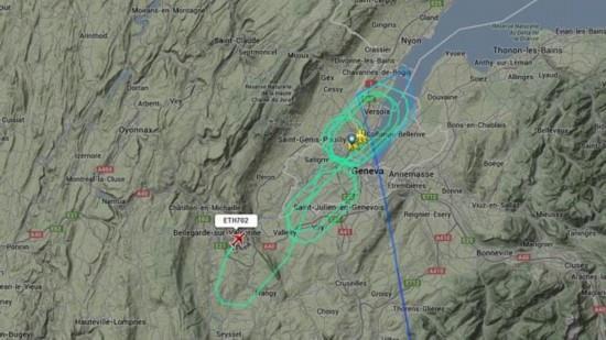 埃航702航班飞行路线图,可见该航班在日内瓦周边上空兜圈