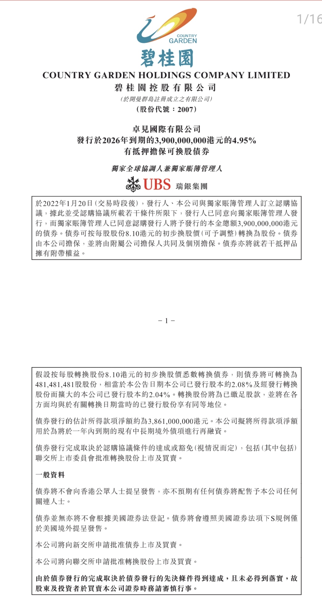 1月21日,碧桂园发布公告称,公司已成功发行于2026年到期的39亿港元可转债,票面利率4.95%。