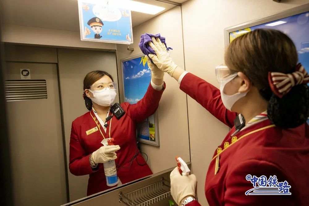 为做好春运保障工作,中国铁路北京局集团有限公司北京客运段根据不同阶段客流特征,强化疫情防控工作。列车运行途中,乘务员定时对车厢各部位进行全面消毒,确保旅客出行安全。