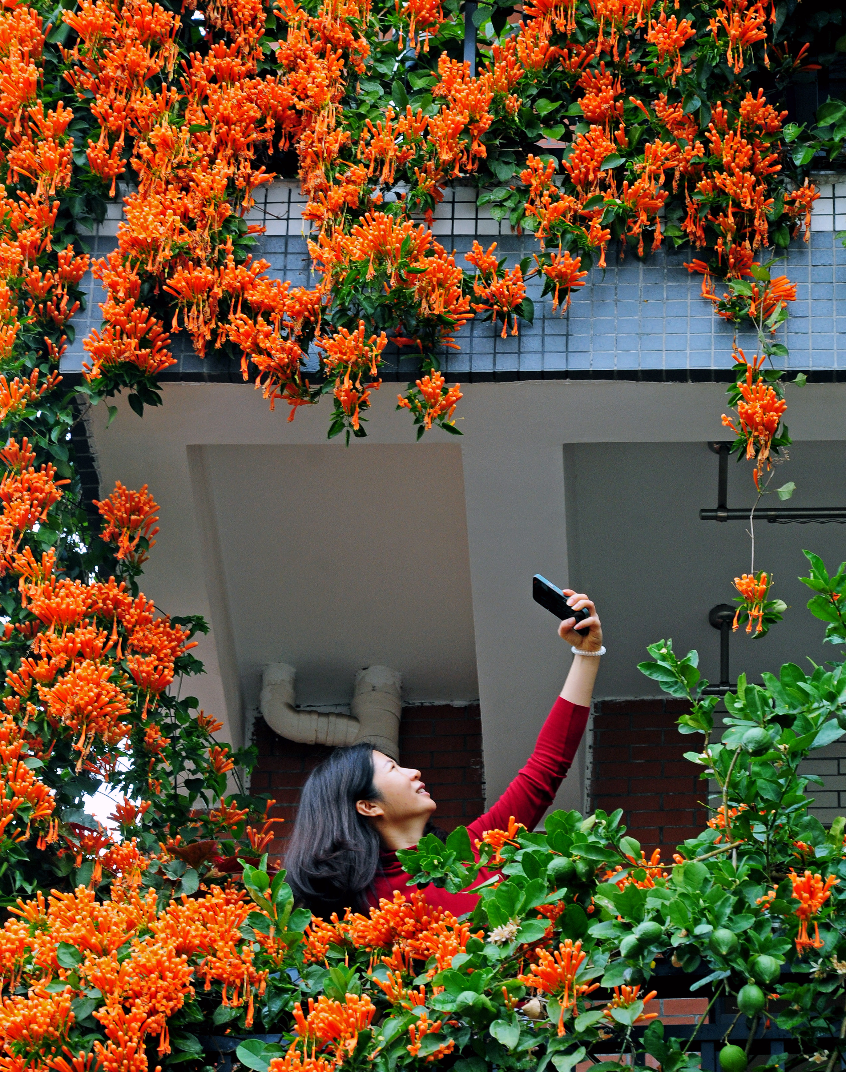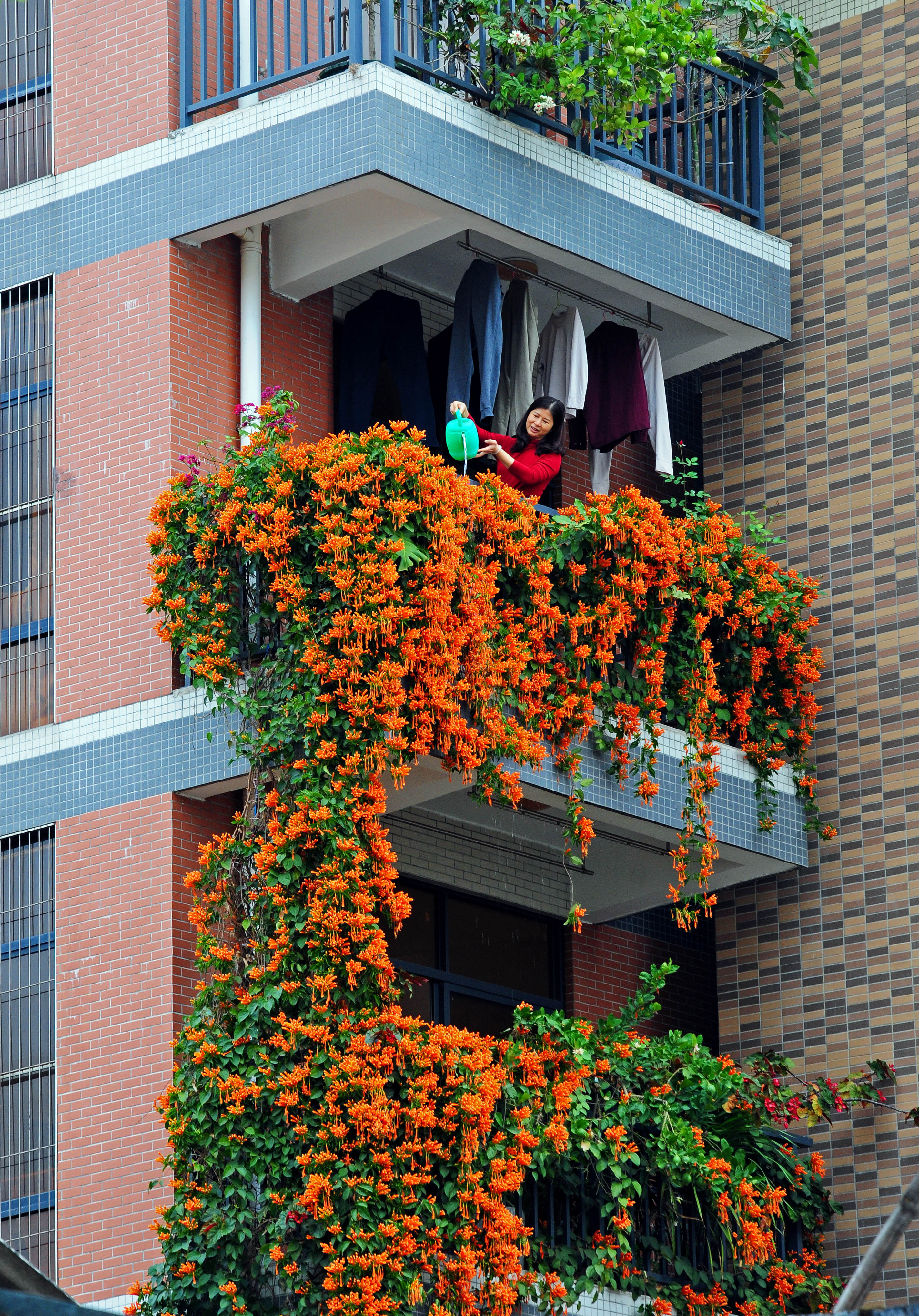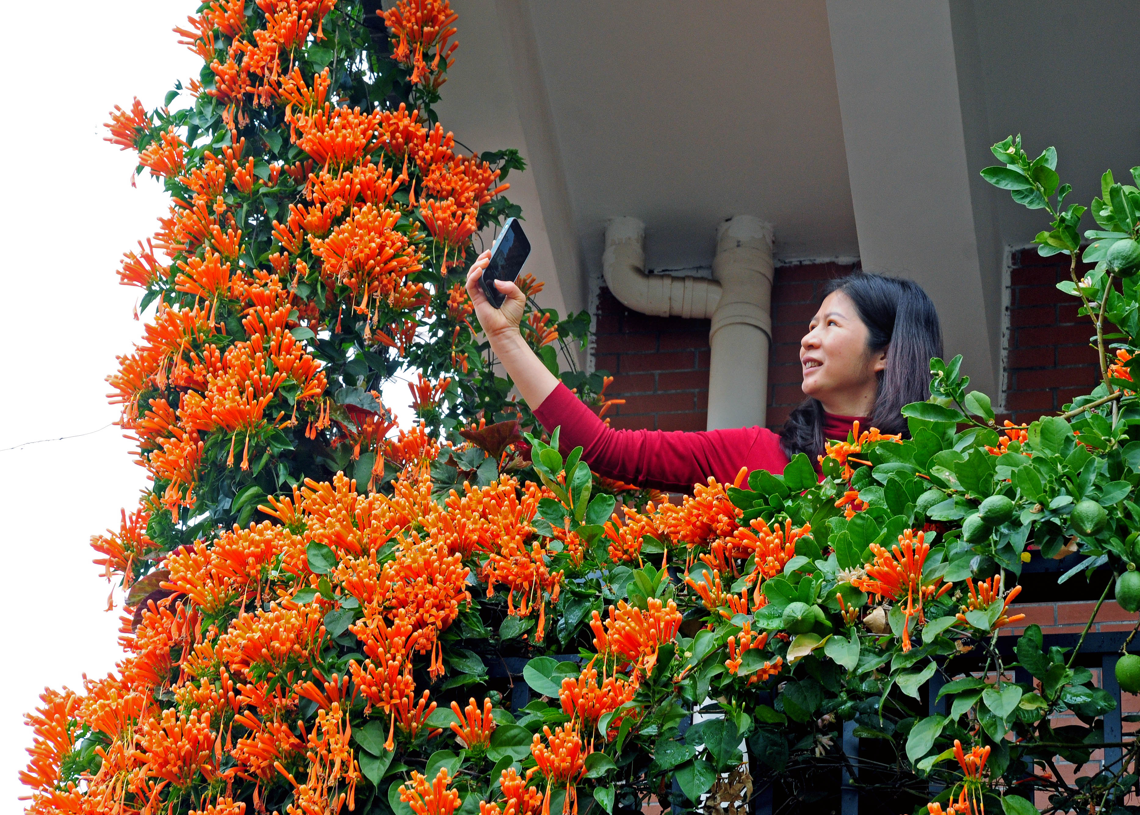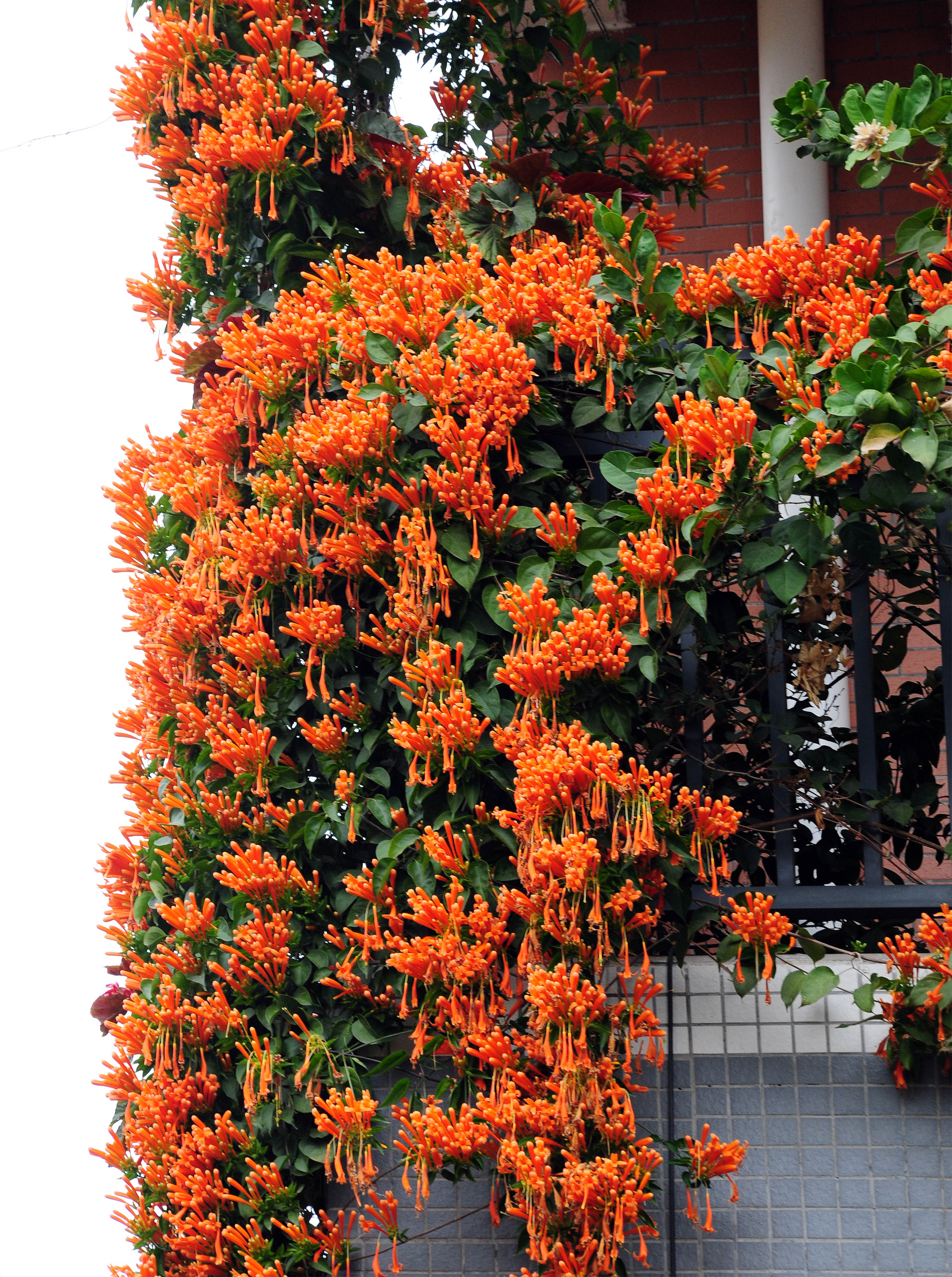 在花都区秀全街马溪村南岳社,村民姚大哥家中大门口处,一棵炮仗花树沿着墙壁攀爬而上,串串艳丽的炮仗花挂满了楼房的院墙和二、三层的阳台,俨然一道艳丽的“瀑布”倾斜而下。