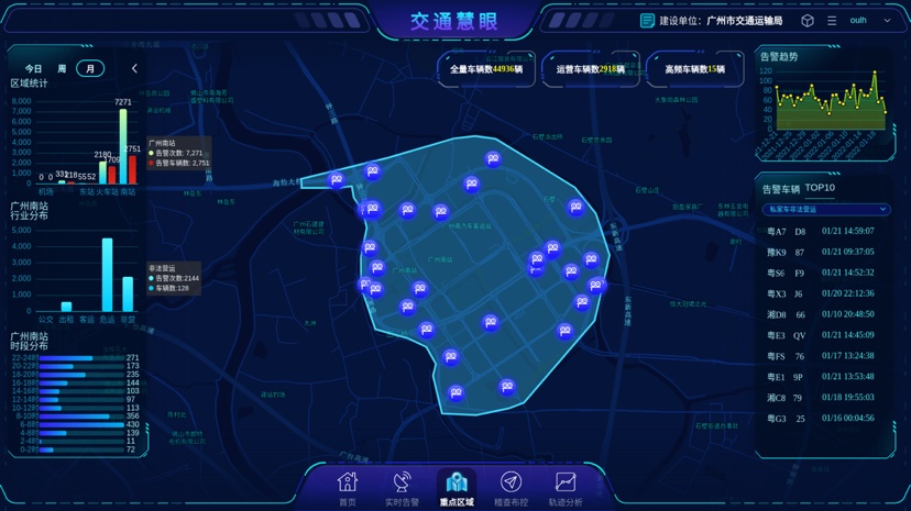 这其中就包括对非法营运车辆的告警,“通过集成分析广州南站区域重要路段的视频卡口信息,对车辆运行情况进行融合分析,研判疑似非法营运车辆,同步将相关信息推送给执法部门,通过科技手段助力精准执法。”广州市交通运输局科技信息处工作人员告诉记者。记者注意到,在告警车辆目录中点开一个车牌号,就能看到视频抓拍和智能分析的画面、车辆相关信息、还有车辆经过视频卡口的次数,并且经过10次、经过5次、经过1次,按不同颜色进行区分,更为简明直观。“这辆车在广州南站高频次出现,有一些卡口一天就经过10次以上,车辆轨迹还散布在全市很多地方。同时,系统自动比对了车牌号,它不是出租车或网约车,根据这些特征,我们研判这辆车疑似是非法营运车辆,数据推送给交通执法部门开展进一步的排查处理。”该工作人员说。