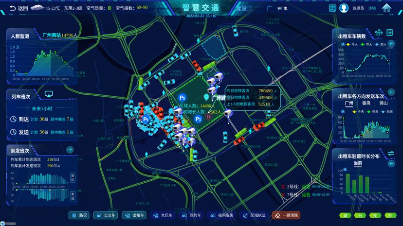 在综合枢纽方面,智慧交通系统接入的数据更加全面,升级打造综合枢纽运力调度场景,为保障出行提供更加完善的技术支撑。“智慧交通系统共享接入广州南站的车站大屏、城市交通运力、快速接客区接客时长等信息,更精准做好运力调度。同时,还可以综合监测广州南站区域实时人数,列车班次、未来正晚点情况,以及配套城市交通运力(公交地铁、出租网约车、客运大巴等)情况,并将上述信息进行关联分析。”该工作人员告诉记者,当夜间地铁收班后,如果出现运力紧缺,指挥中心会将调度指令下发到出租车终端,调度车辆。系统也同时监测南站附近出租车的驻留时长分布,大部分出租车驻留时长在1小时以内,既保证出租车可用、满足客流需求,又避免出租车等候过长,也有助于科学合理调配运力,形成良性循环。