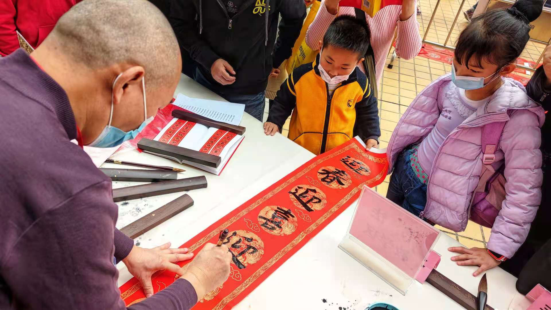 贴挥春是过年的重要仪式,是春节的标配,是广州人过年不可忽略的一种年味。“千门万户曈曈日,总把新桃换旧符”当人们在自己家门口贴挥春时,意味着春节正式拉开帷幕。活动现场,主办方特邀书法名家教授市民朋友们写书法,现场教学,书法名家还按照市民朋友们自选或自拟的挥春内容,挥毫泼墨,用心写下一对对充满祝福的春联。