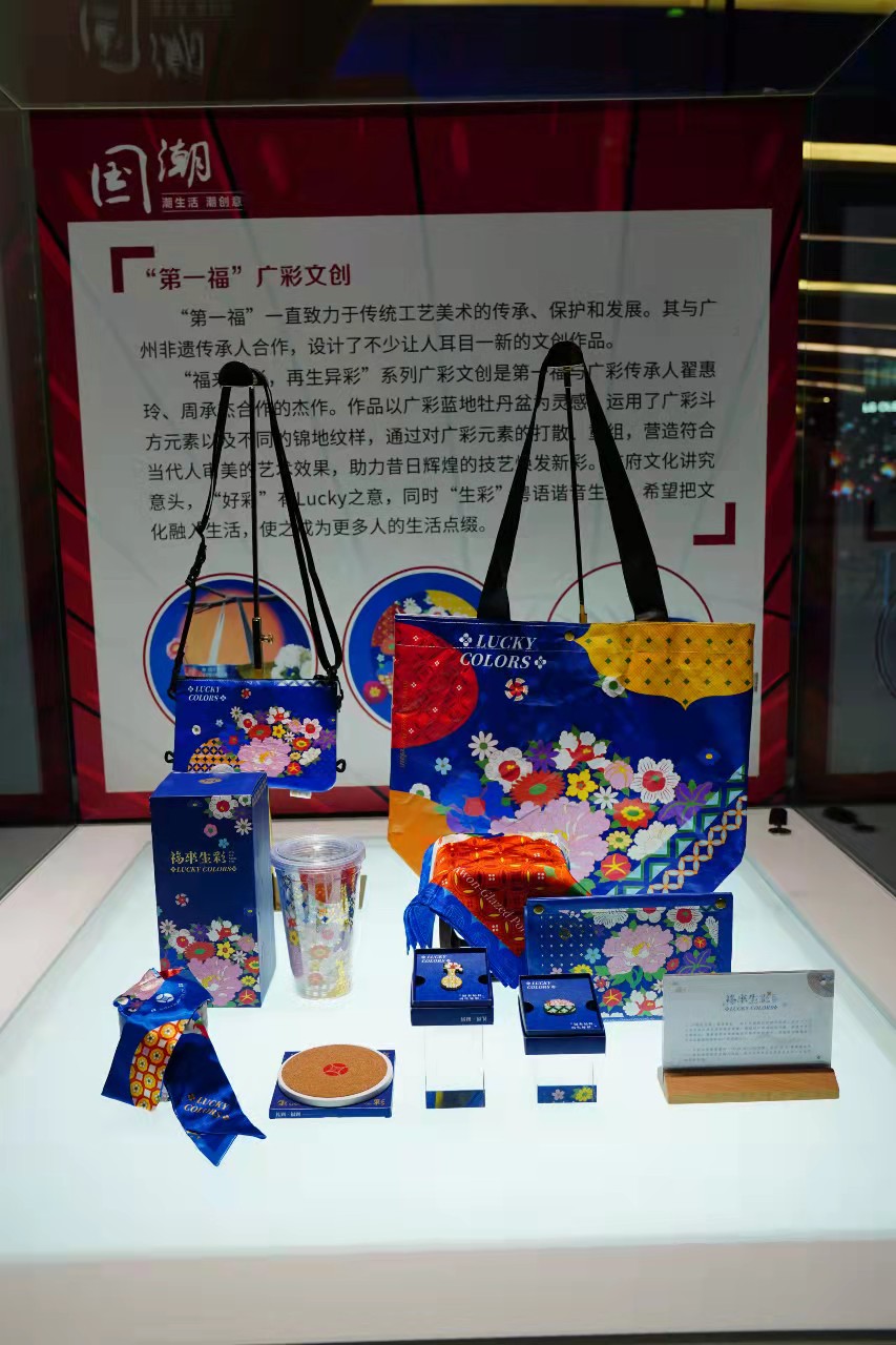 “国潮·潮生活 潮创意”展区,呈现了引入设计、动漫、影视等元素进行文化创意的活化利用路径。包括广彩、广州珐琅、广州榄雕的最新文创,车陂扒龙舟“一水同舟”社区品牌项目、肌骨同治疗法活化利用推广、舞剧《醒·狮》、广州非遗新生代研培等成果。在本展区中,特别设立“广州非遗虎年文创”展位,汇集了多件以虎为题材的广绣屏、宫灯、铜壶、西村窑福虎瓷、剪纸、泥塑等虎年最新文创,还有荔湾区非遗协会对口帮扶贵州惠水县的“粤贵虎”主题公仔,传递出广州非遗传承人群自觉活化利用非遗资源的热忱。
