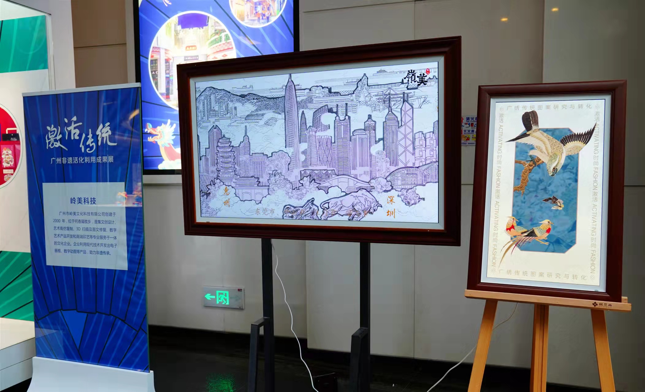 “科技·新技术 新应用”展区,呈现了科技与非遗相互赋能的活化利用路径。包括三七互娱将非遗融入游戏、抖音广州非遗馆、广州美术学院和广州图书馆的粤享粤美「Y·Art」岭南文化创意设计展、广州联通的“5G,直达非遗微现场”、岭美科技电子画框等成果。