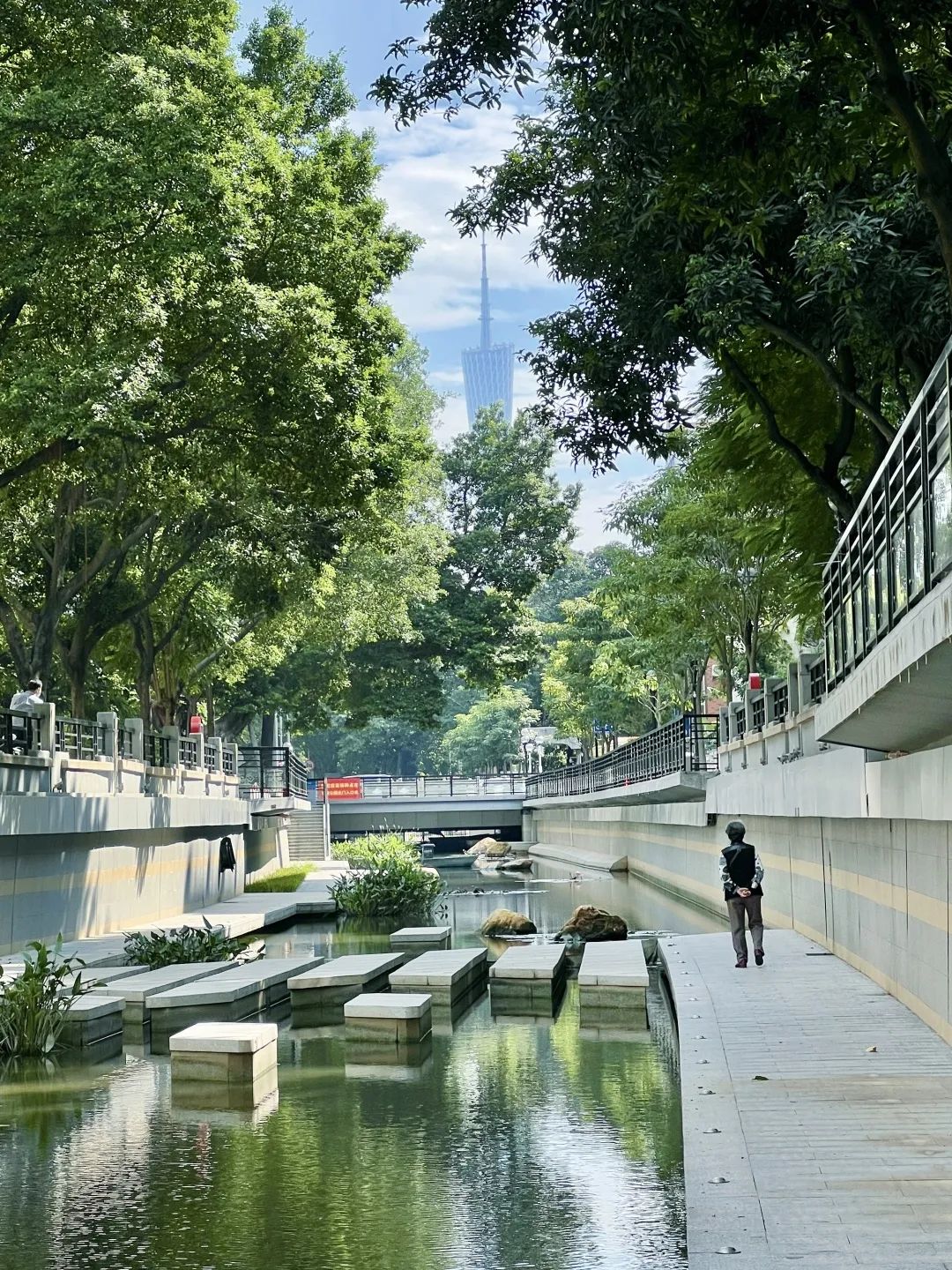 蓝天下的猎德涌水质清澈,水位较低,涌底的水草恣意生长。