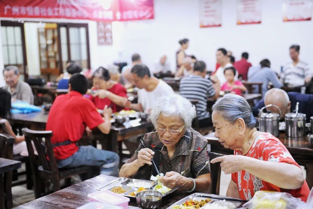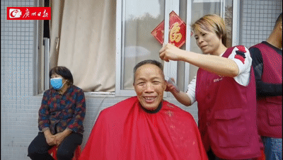 广州市番禺区石碁镇长者餐厅,理发志愿者为老人免费剪发。