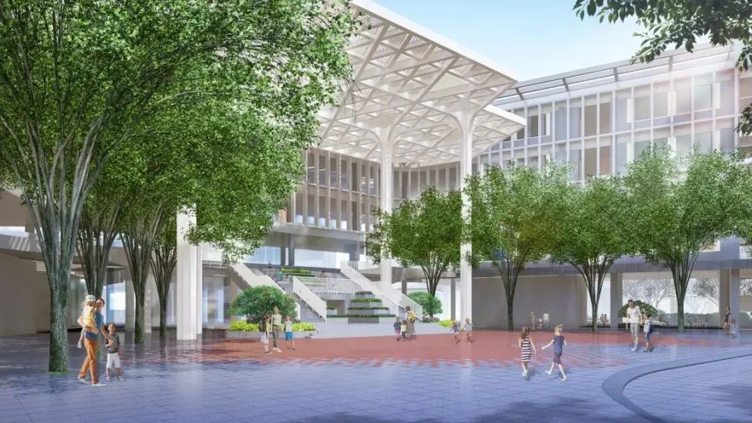 小南了解到,项目邀请何镜堂院士团队操刀设计,针对项目需求和用地地形及方位特点,何镜堂院士提出了“建构次级地面”的纵向布局构想,把岭南园林的主题校园提升到标高6米的架空平台之上,平台下则主要布置后勤辅助空间。教学区、宿舍区、行政区和运动区分别布置在东、西、南、北四个方位,以连廊衔接,从而形成向心围合的平面格局。