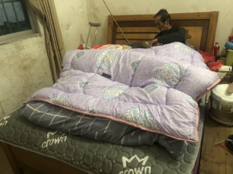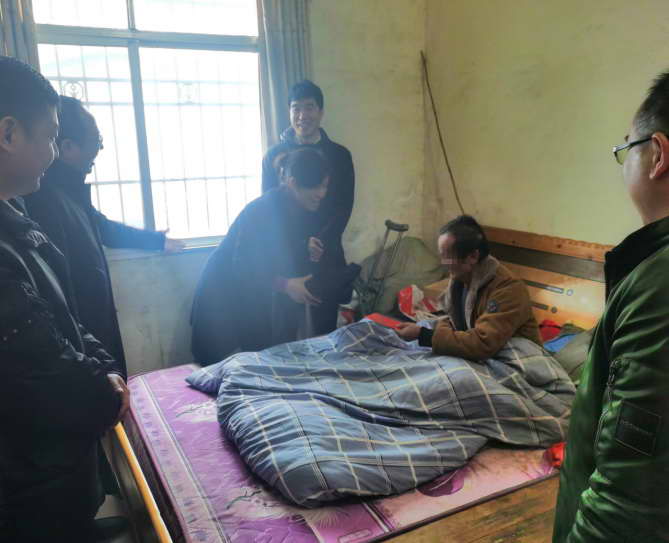 在上阳陂村返贫监测户邓传胜家中,工作人员送去了慰问金和棉衣,并详细询问他中风后的身体状况和生活现状。当发现邓传胜身下的单薄床垫和棉被时,及时购置了2套全新被褥给他及家人,并叮嘱他注意保暖、鼓励他努力在床上进行锻炼、配合治疗、早日康复。