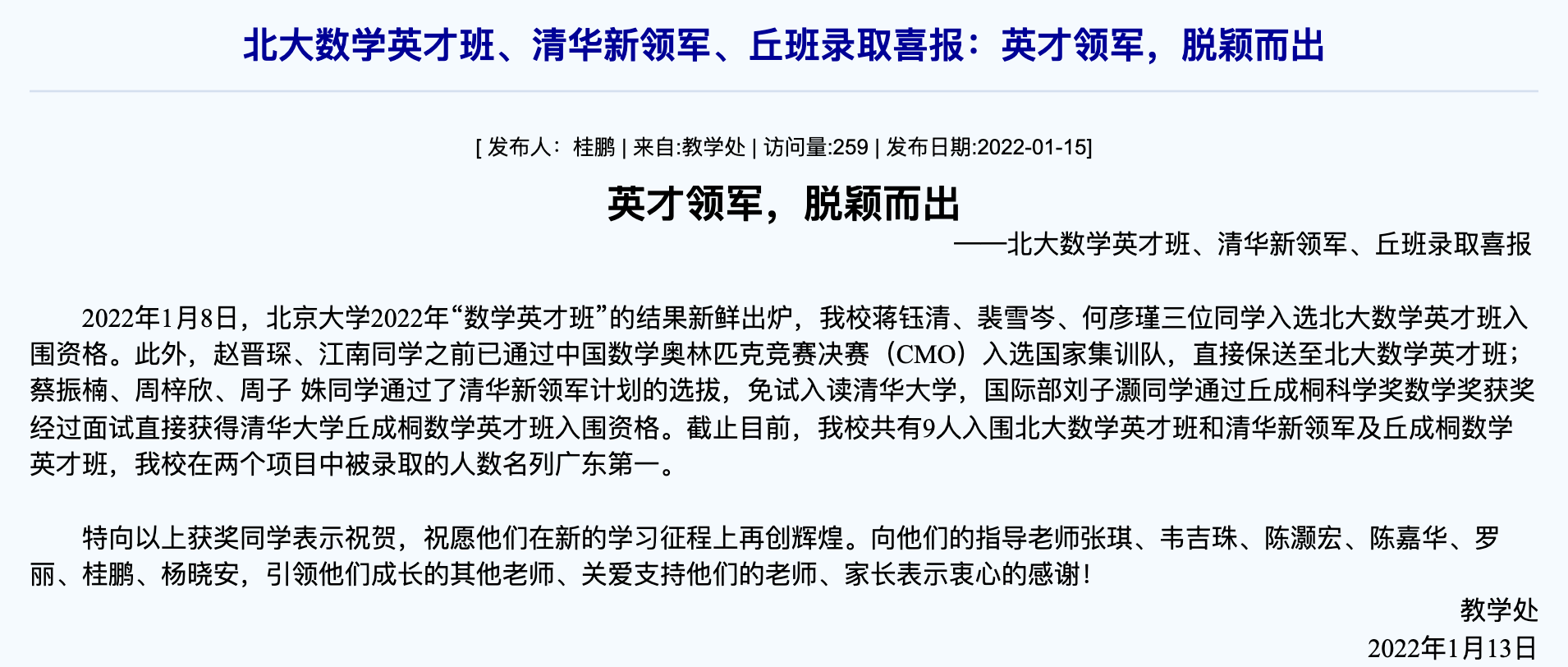 截至目前,该校今年共有9人入围北大数学英才班和清华新领军及丘成桐数学英才班。