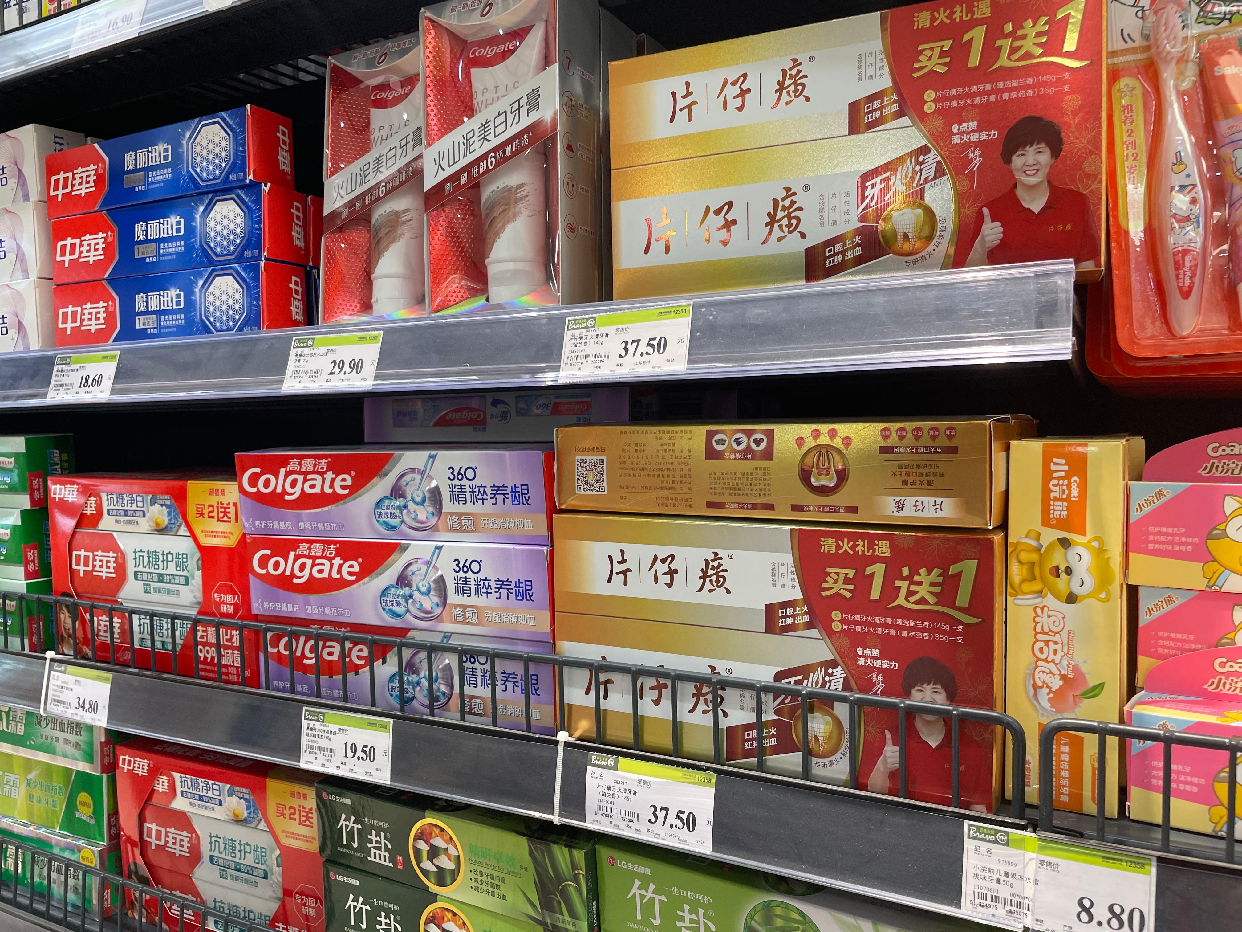 (超市货架上陈列着片仔癀日化产品)