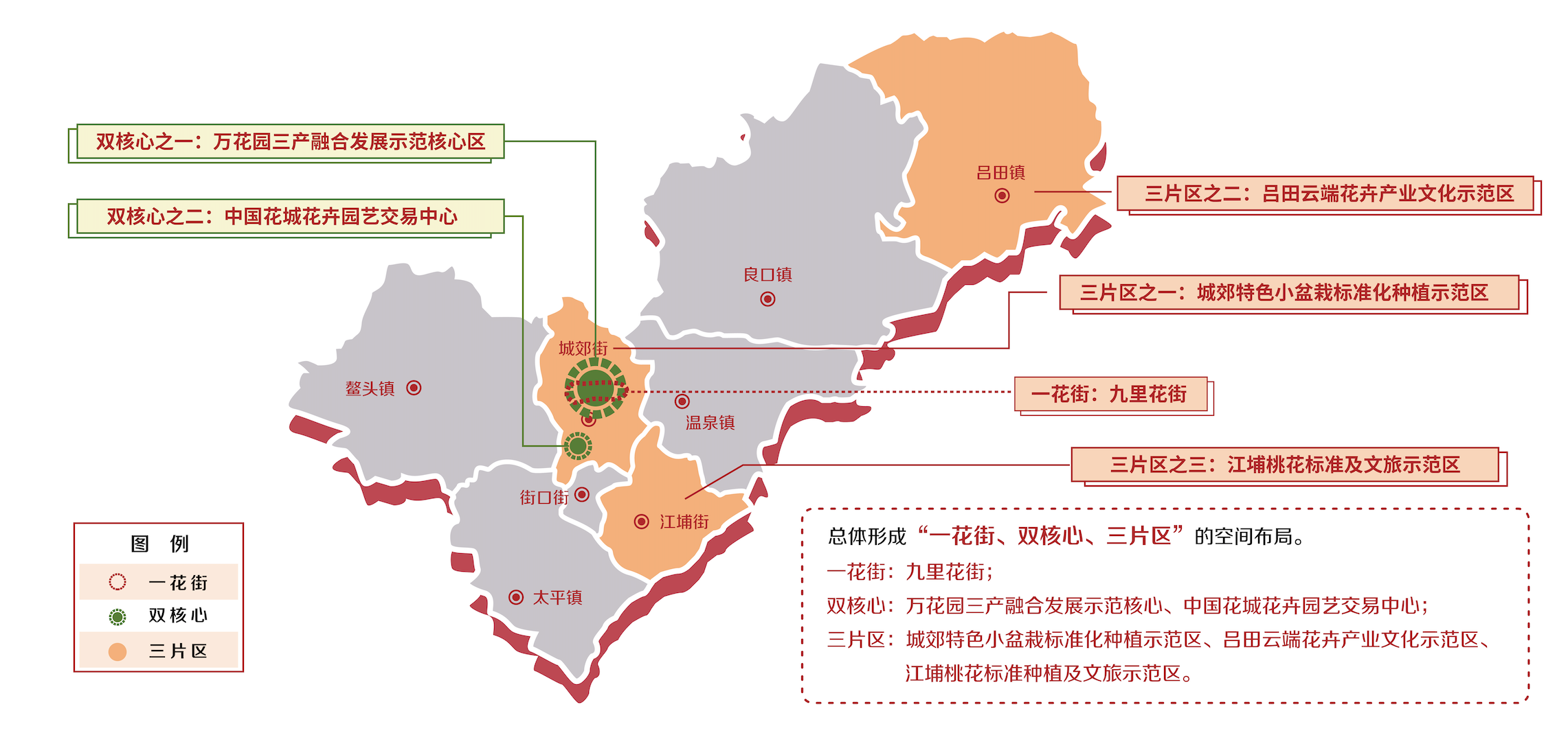 该园区国土总面积为93.17万亩,覆盖农户3.28万户、农民9.8万人,以花卉苗木为主导产业,主要产品包括优质小盆栽、兰花、种苗、鲜切花、特色苗木等。自创建以来,产业园花卉种植面积增至3.1万亩,已基本建成集花卉繁育、种植、加工、交易、仓储物流、创新创业、科普研学、文化休闲于一体的全产业链,2021年产业园区总产值58亿元,其中主导产业总产值38亿元,占总产值的65.5%。
