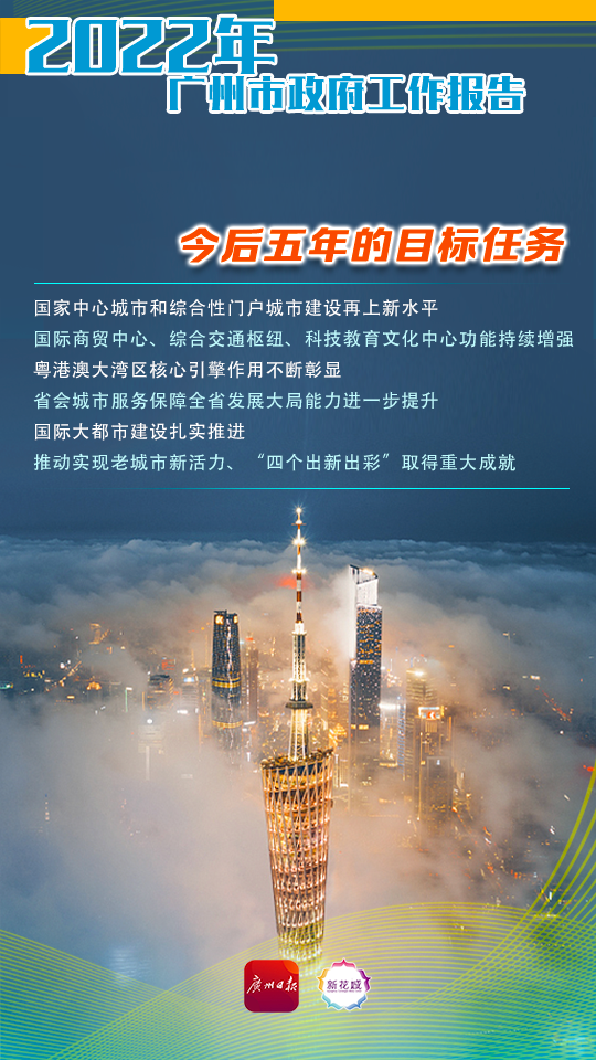 今后五年的目标任务是:国家中心城市和综合性门户城市建设再上新水平,国际商贸中心、综合交通枢纽、科技教育文化中心功能持续增强,粤港澳大湾区核心引擎作用不断彰显,省会城市服务保障全省发展大局能力进一步提升,国际大都市建设扎实推进,推动实现老城市新活力、“四个出新出彩” 取得重大成就。
