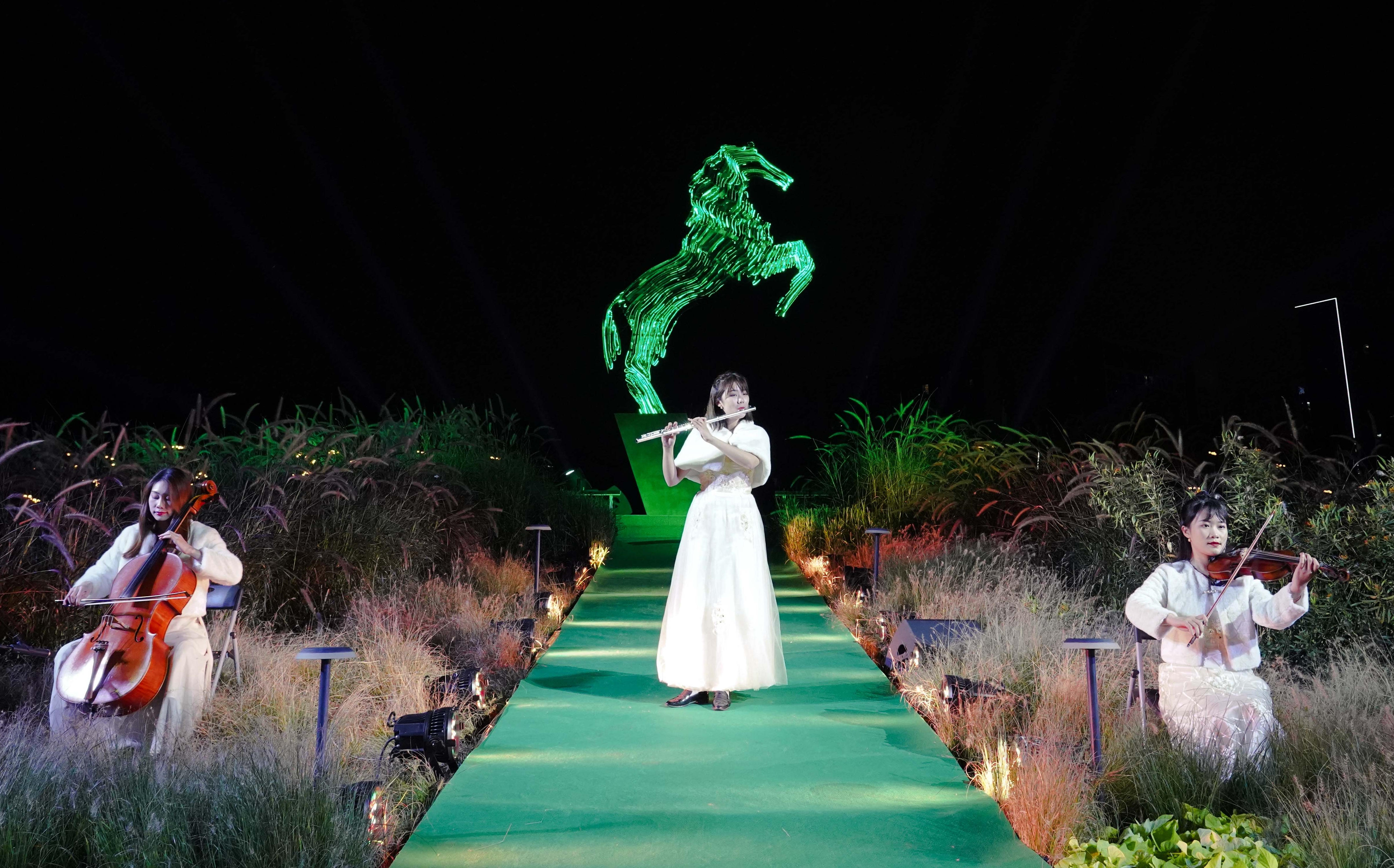 狗尾巴草与夕阳下的蓝天相映成趣的山顶公园风光,聆听浑厚的大提琴与激扬诗朗诵的诗篇交织出清丽婉转的花腔女高音,带来一个难以忘怀的“绿马之夜”。当来宾一起用掌纹温度,触发漫野流光,山顶的数字钢马被绿色光线充满全身,顷刻,“绿马”诞生,绿色希望之马奔腾!