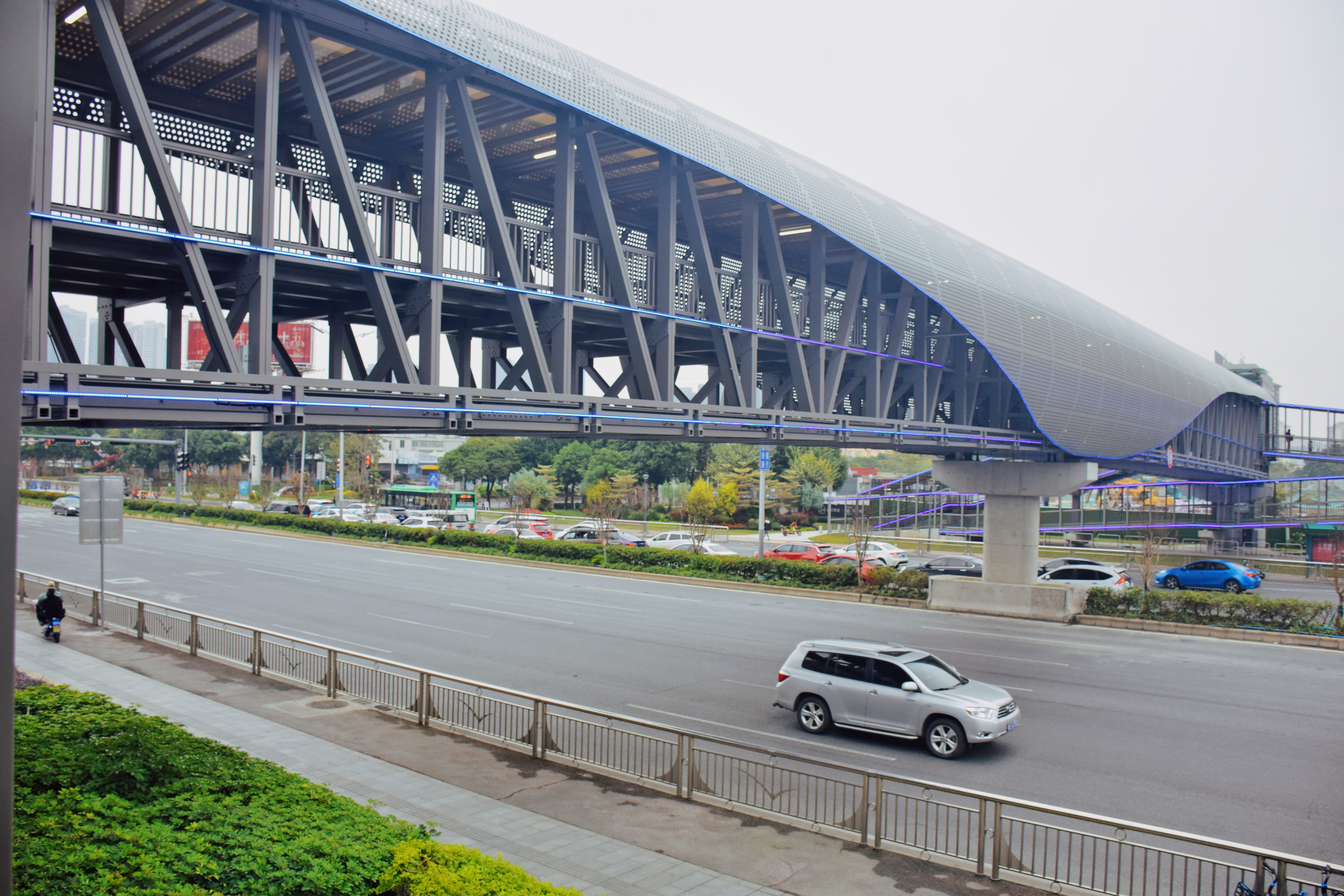 正式启用的佛山大道(澜石路口)人行天桥以其独特的设计和外观,将成为禅城区新的网红地标。该桥为铝合金桁架结构,主桥总长 89.54米,主桥桥宽横跨佛山大道,宽度为5.9米。该桥造型设计灵感主要来源佛山南狮子的犀利眼神。其中,蜿蜒的弧度又如大鹏展翅般气宇轩昂,时刻彰显佛山禅城区辐射粤港澳大湾区西部的商业决心。天桥整体呈现“工”字型结构、两条人行梯道和两条坡道能最大限度地汇入人流实现畅通出行,同时顶棚结构的贴心设计能为过往行人遮蔽风雨。