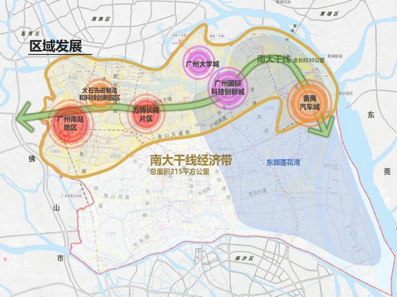 记者注意到,广州南站、万博长隆片区、华工国际校区、广州大学城有个共同的地理坐标:位于南大干线之上。