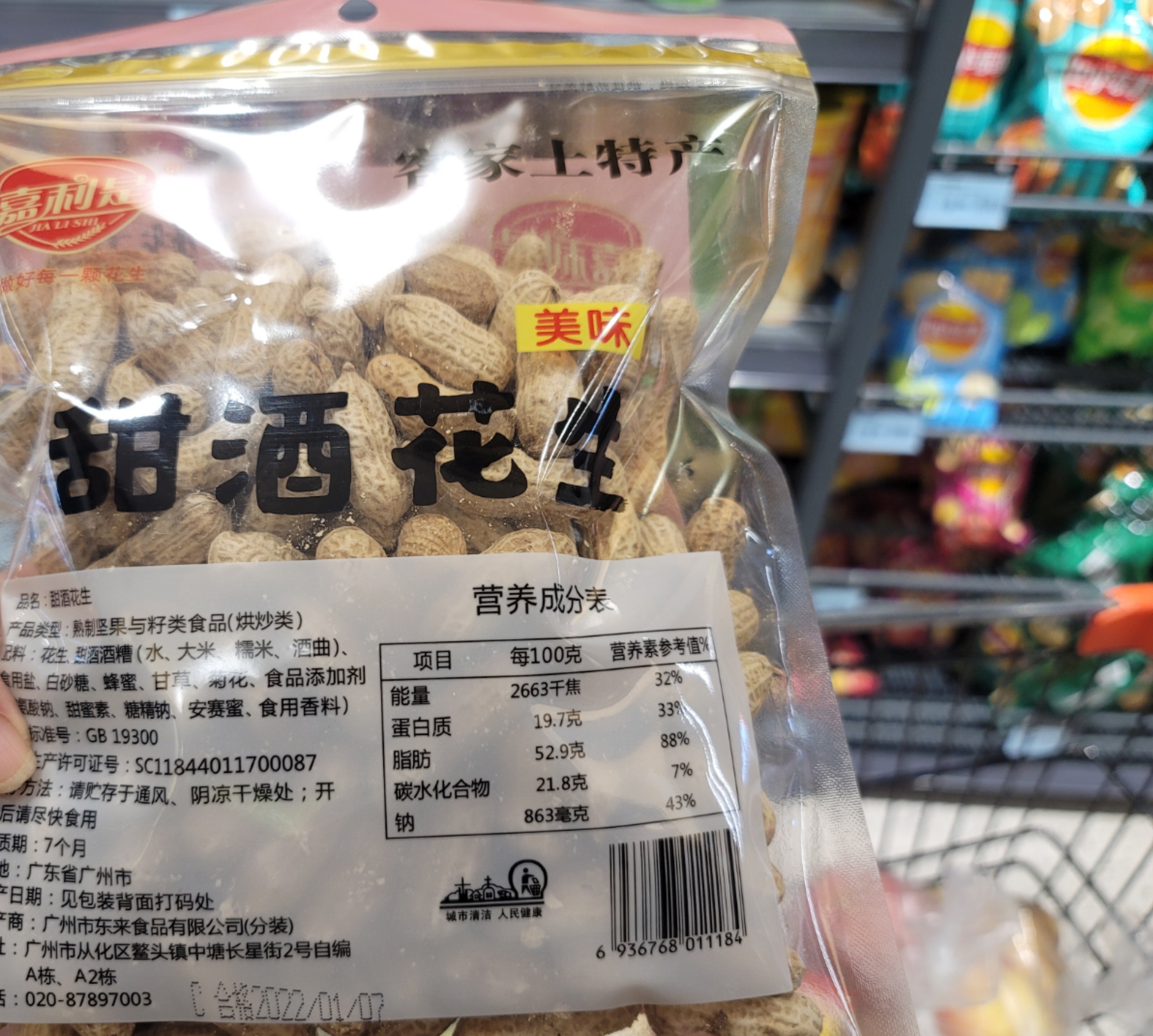 在超市休闲食品区,加工程序过多的坚果类食品,脂肪含量整体较高,琥珀核桃仁、奶香味巴旦木、甜酒花生、黑瓜子的脂肪含量分别高达66g/100g、53.4g/100g、52.9g/g和44.8g/100g;