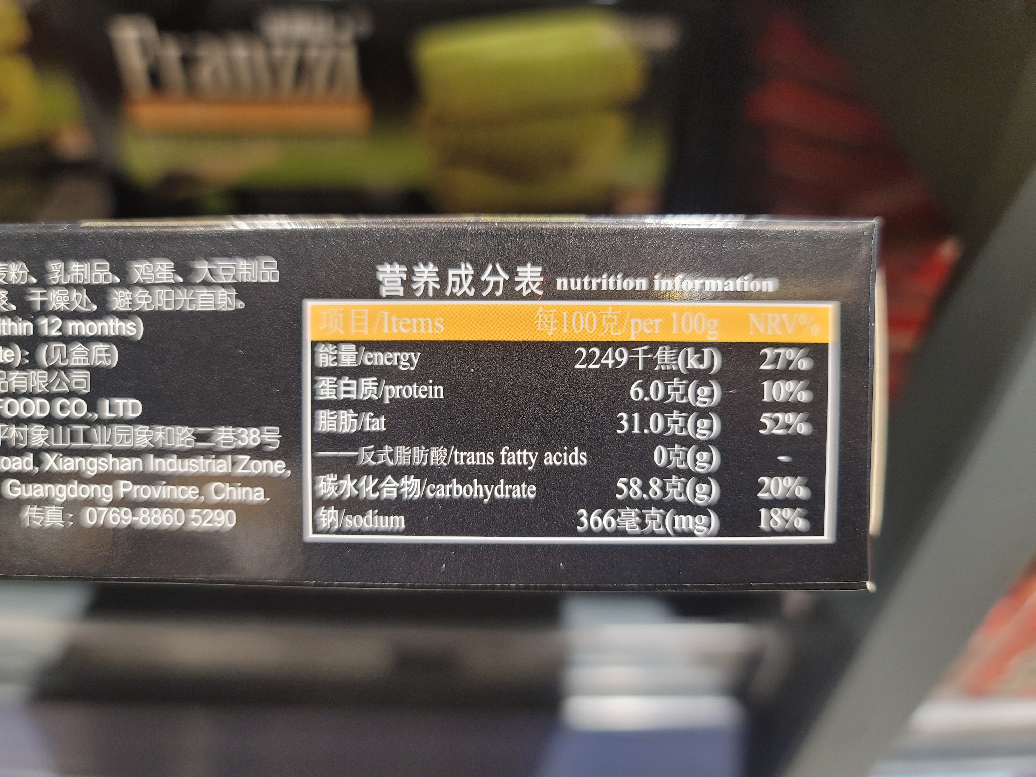 抹茶慕思巧克力味曲奇和小麻花的脂肪含量分别为31g/100g和35g/100g。高脂往往伴随着高热量,上述食品能量均在2200KJ/100g以上。