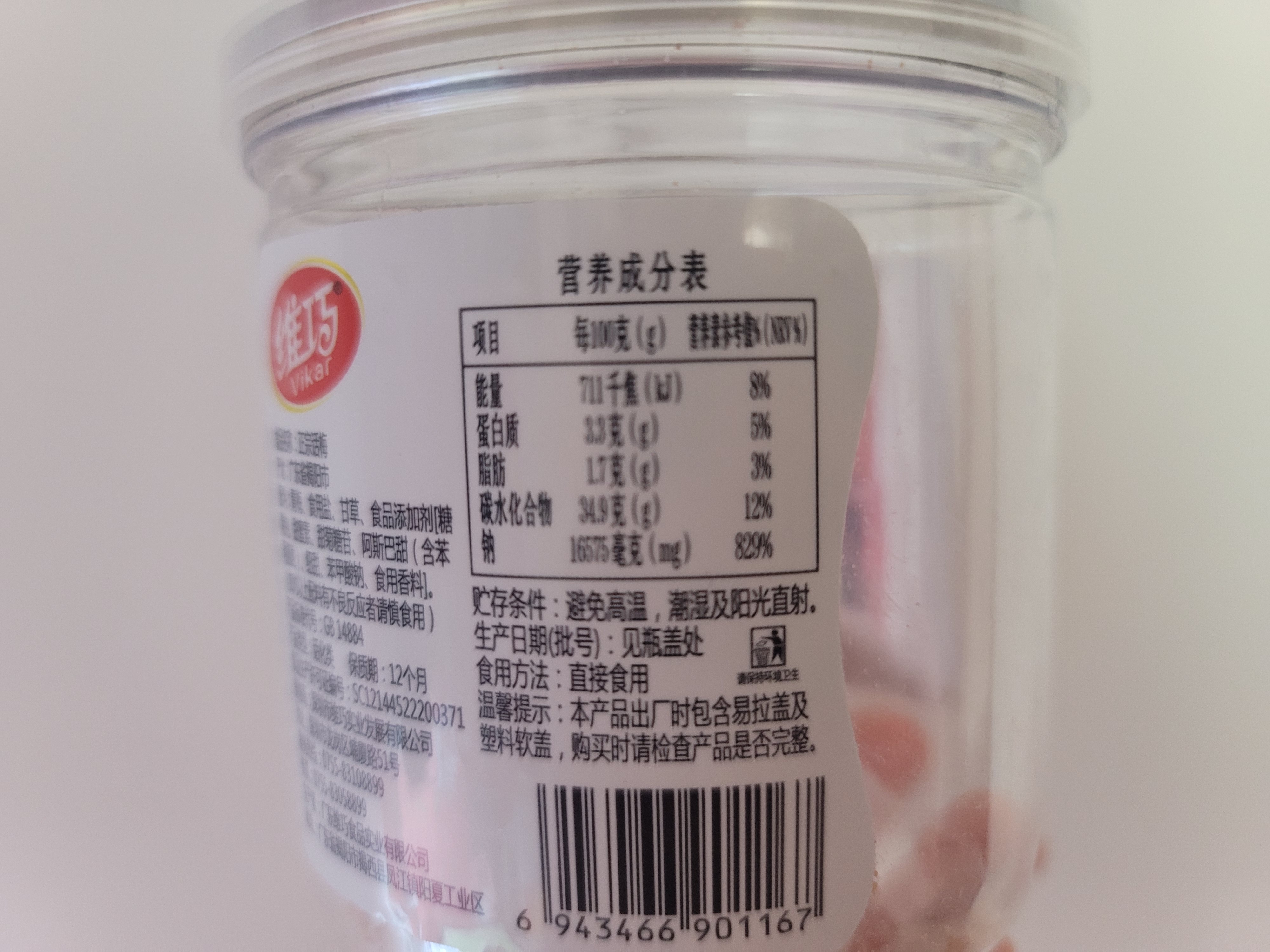 值得注意的是,市面上部分宣称具有“生津止渴”“开胃助消化”等功效的话梅,钠含量竟然比辣条更高。记者查看了某社区团购平台售卖的两款话梅的营养成分表发现,钠含量分别高达13440mg/100g和16575mg/100g,严重超标。此外,还有柠檬酸、甜蜜素、糖精钠、阿斯巴甜、食用香精等多种添加剂。