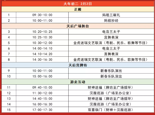 距离春节还有一周不到,充满期待与活力的虎年即将到来。记者从广州南沙区天后宫获悉,年初一至年初七正常营业,营业时间为8:30-18:00。除了每天准时营业,还有精彩节目为您贺岁。