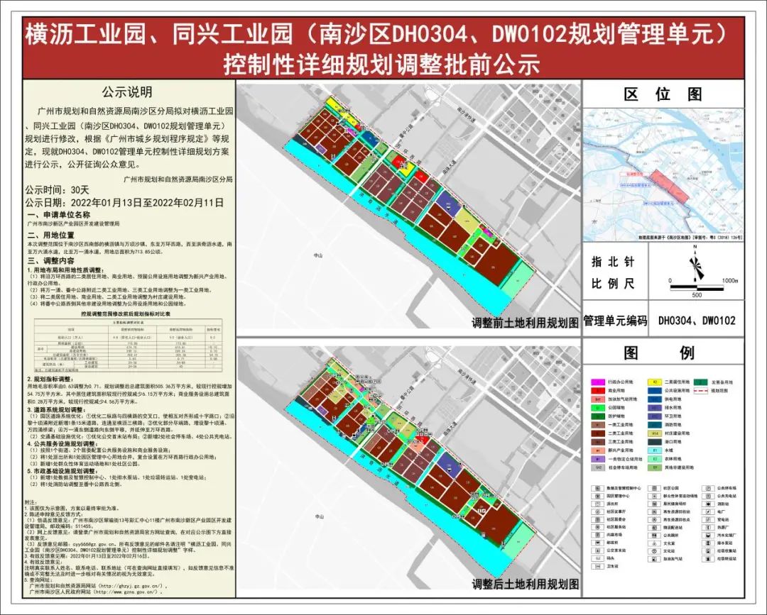1月13日,由南沙产业园管理局组织开展的横沥工业园、同兴工业园(南沙区DH0304、DW0102规划管理单元)控制性详细规划调整方案开始批前公示,在广州市规划和自然资源局网站以及南沙区人民政府网站上可查询相关信息。
