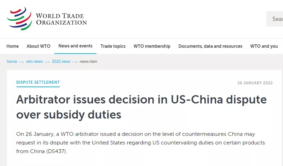 该贸易争端裁决始于2012年,当时中国因美国对太阳能电池板等中国产品征收反补贴关税,将美国诉至世贸组织。此前世贸组织已裁决美国相关措施违反世贸组织规定,并得到了上诉机构的支持。