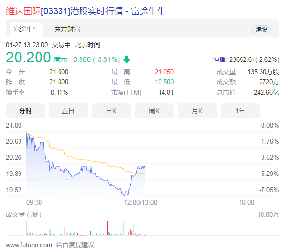 1月26日,维达国际发布2021财年年报称,公司在2021年实现营业收入186.76亿港元,同比增长13.11%,归属母公司净利润16.38亿港元,同比下降12.59%。27日,截至记者发稿时,维达国际股价为20.200港元,股价下跌3.81%。