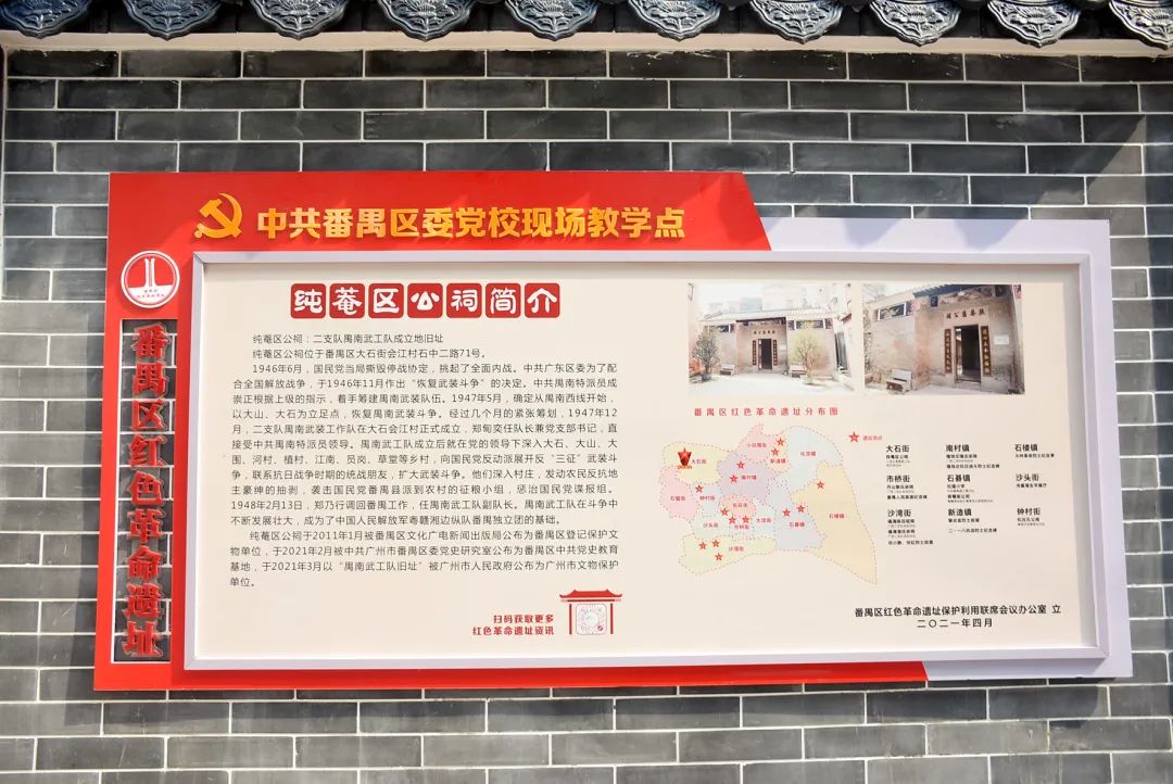 二支队禺南武工队成立地旧址(纯菴区公祠)(下简称为“禺南武工队旧址”)位于番禺区大石街会江村石中二路71号。2021年以来,大石街活用本地红色资源,着力保护好红色革命遗址,对其提档升级,打造“家门口”开放式的红色教育基地,深入挖掘和讲好党史故事,切实上好党史学习教育这门“必修课”。