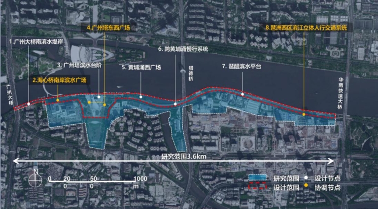经过前期调研、科学研判和专家论证,此次竞赛重点选取广州大桥南滨水堤岸、广州塔滨水台阶、黄埔涌西广场、跨黄埔涌慢行系统、琶醍滨水平台等5个设计节点,针对相关节点存在的服务功能相对缺乏、空间开敞度不够、空间品质有待提升、慢行道不够畅通等问题进行优化设计。