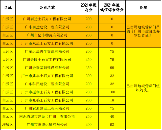 记者在公示中注意到,白云区的广州轲达土石方工程有限公司、广东轲达建设工程有限公司、广州市亿丰物流有限公司、广州市永晟土石方工程有限公司4家建筑废弃物运输企业2021年度诚信综合评分为0,并已由属地城管部门吊销《广州市建筑废弃物处置证》。