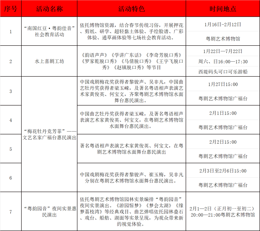 正月初一至初六每天下午,粤剧艺术博物馆举办“梅花牡丹竞芳菲”——文艺名家广福台惠民演出活动,中国戏剧梅花奖得主(黎骏声、吴非凡、苏春梅、崔玉梅等)、中国曲艺牡丹奖得主(梁玉嵘)及著名粤语相声表演艺术家黄俊英、何宝文等文艺名家将走进粤剧艺术博物馆广福台轮流领衔演出,粤剧优秀私伙局团队将进行展演交流,丰富假期文化娱乐生活。