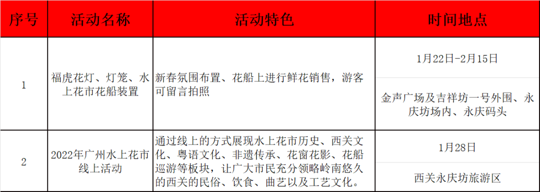 行花街、转大运,是广州人的过年习俗。“水上贩花”是西关花市一大特色。今年春节,西关永庆坊旅游区将通过线上的方式展现水上花市历史、西关文化、粤语文化、非遗传承、花窗花影、花船巡游等板块。